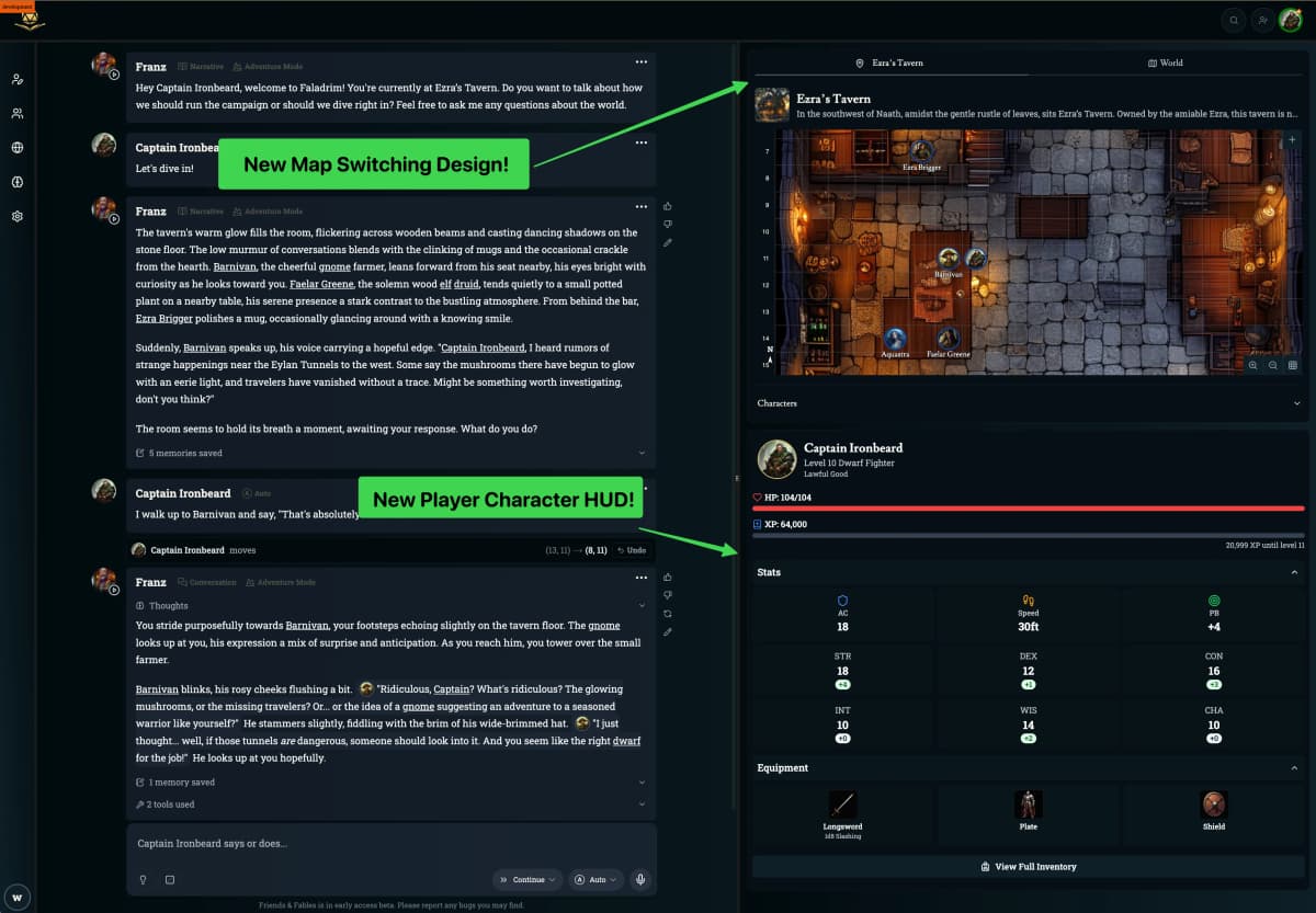 Hey Friends, we’re excited to announce ACE-1.5 (Agentic Campaign Engine). This update is huge for both players and world builders! Our campaign engine now supports POI maps, conversation mode with NPCs, and much more. You should notice more lifelike and engaging NPCs, higher accuracy representing scenes, and improved accuracy with things like traveling, picking up items, etc. With ACE-1.5, Friends & Fables really starts to feel like something in-between a TTRPG and a video game!