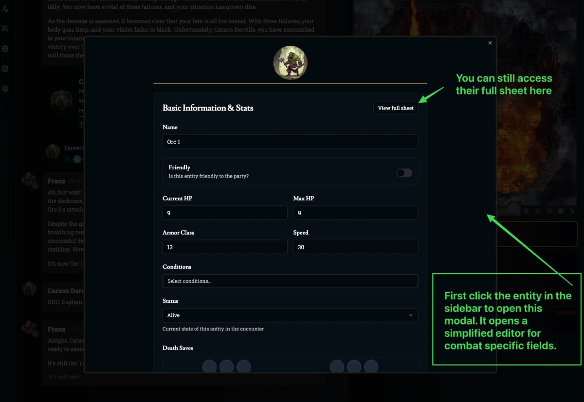 You can now quickly access an entity from the sidebar. We give you a combat-specific version of a character sheet / monster stat block. You can also access the full sheet / stat block by clicking the button in the top right.