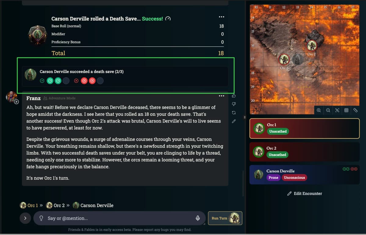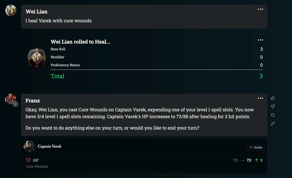 Now that we have conditions in, we can differentiate between 0 HP and dead, vs 0 HP and unconscious. This allows us to handle non-lethal endings. Perhaps you’re in a bar fight and the fight is over once you have knocked them out. Now Franz can handle those situations! Additionally, when your whole party is downed, Franz may decide to end the fight on his own if it makes sense narratively.
