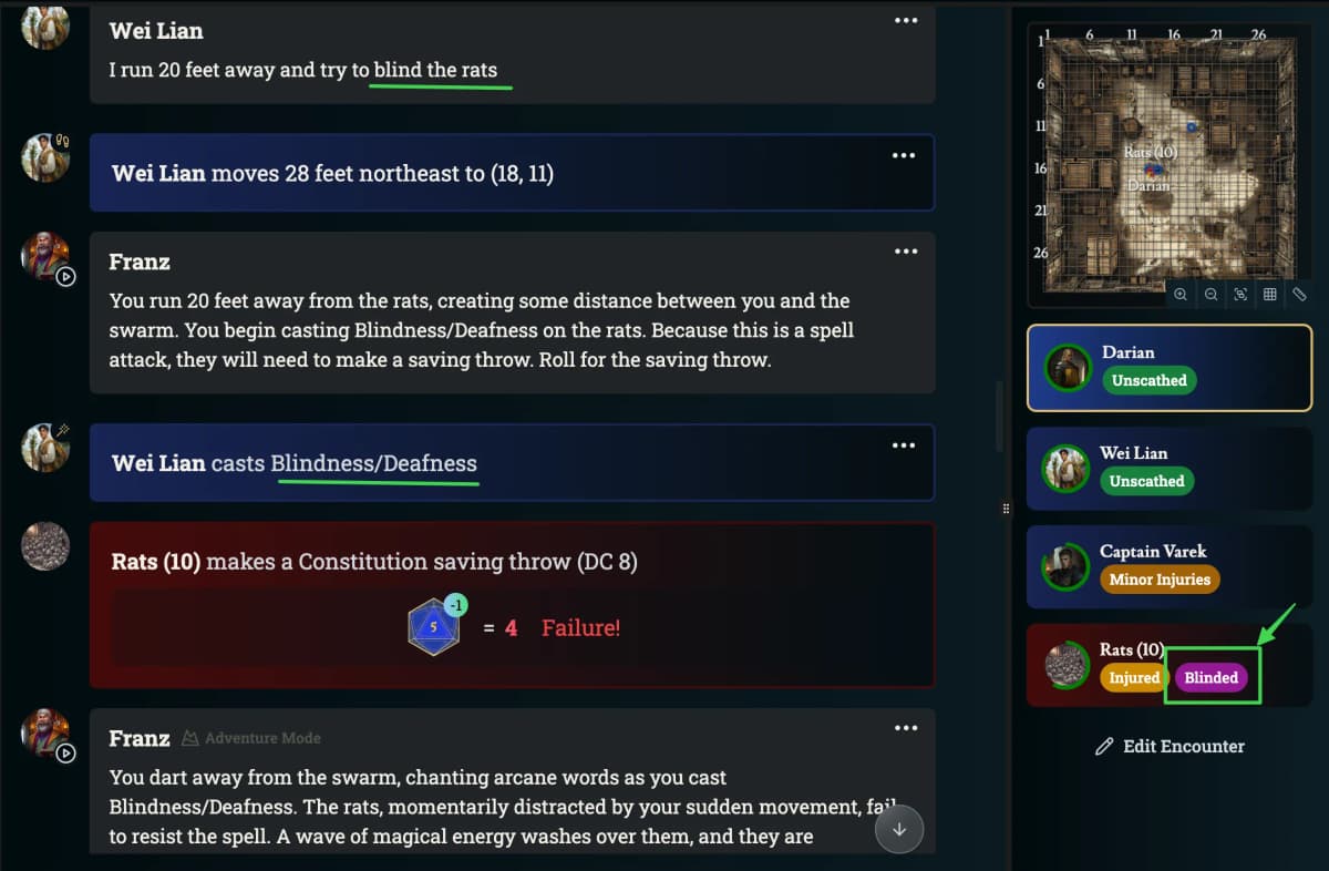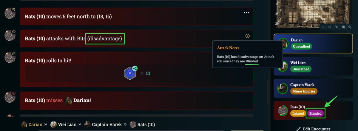 Then during the rats’ turn, you see they have disadvantage on their attack since they are blinded. The game engine takes the effects of the conditions into account!