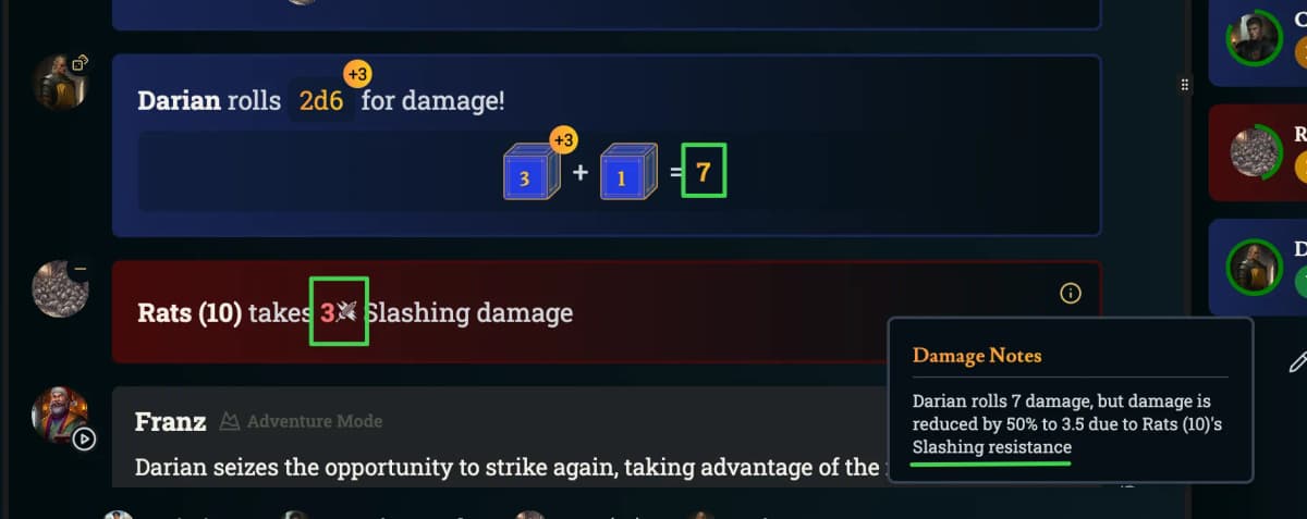 Combat now takes resistances, immunities, and vulnerabilities into account. You’ll see here that the swarm of rats takes 50% damage as they have slashing resistance. If you are immune to a certain damage type, you’ll take no damage from that type, and if you’re vulnerable you’ll take double damage.