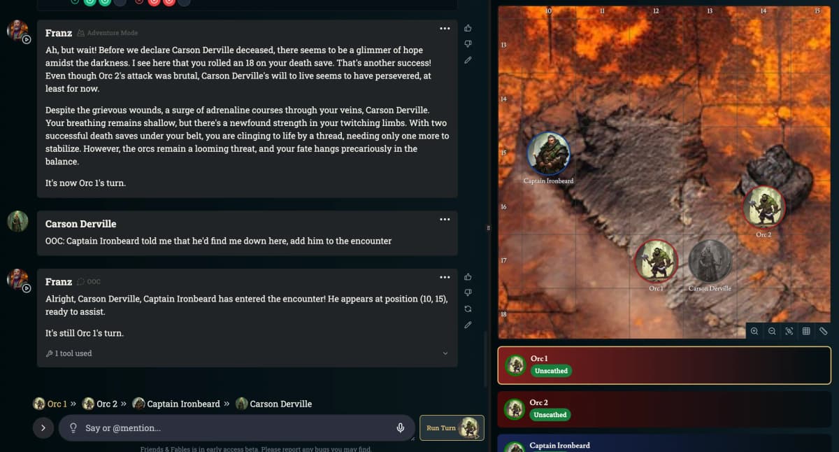 Battlemaps are finally here. When Franz generates an encounter, he’ll use the description of the POI to generate a battlemap. Just like in other VTTs, the battlemap editor also allows you to quickly move characters/monsters around. The thing that sets our battlemap editor apart is that Franz also has the ability to manipulate the map and handle movement. It’s a magical moment when you tell him that you move somewhere (even cooler if you use voice input) and seconds later you see your token moving. I still can’t believe we can do this!