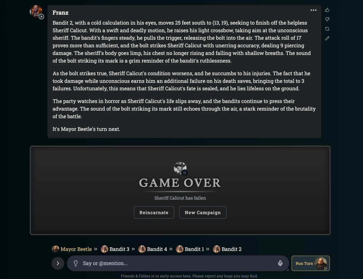 We don’t want your long running campaigns to go to waste if you die, so we’ve built in a reincarnation system. If you fail your death saves or get instant killed, you’ll have a chance to reincarnate as another character, either an existing NPC or a new one that you create. Franz will attempt to weave them into the story.