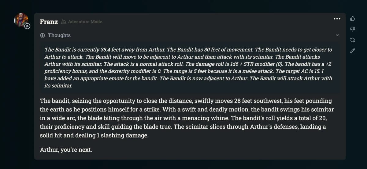 We’ve now expose Franz’s thinking. By default, it’s collapsed so it won’t clog up the message screen, but you can click it open to see what Franz was thinking. This way if an NPC does something unexpected, you can tell if Franz had the wrong information, or if the NPC had a motivation you did not expect.