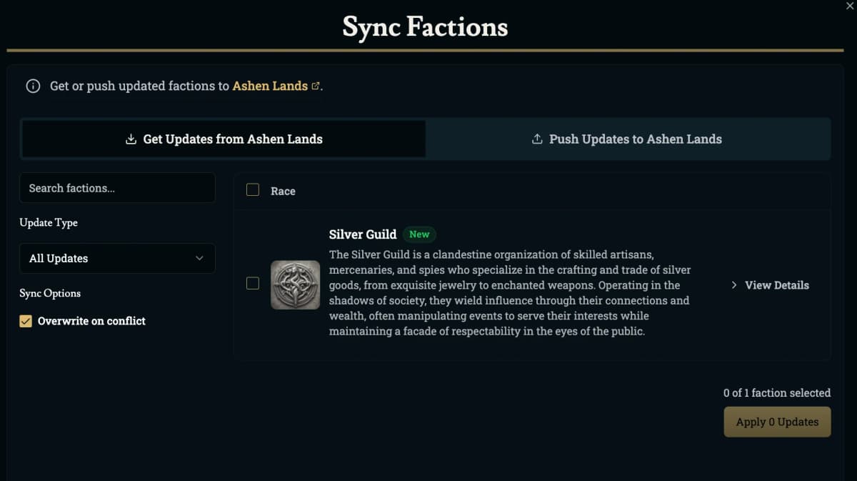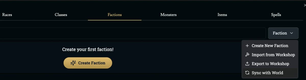 You can now sync factions to and from your campaigns, by using the Sync with World button in a campaign: