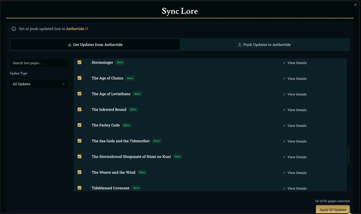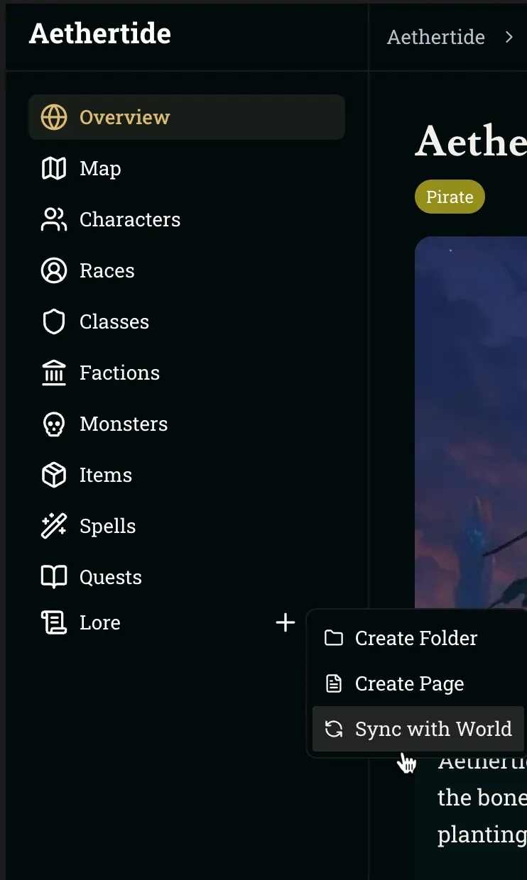 You can now sync all the new lore from world builders into your existing campaigns! To sync Lore, from the world tab in your campaign, click on the + icon next to lore and then ‘Sync with World’