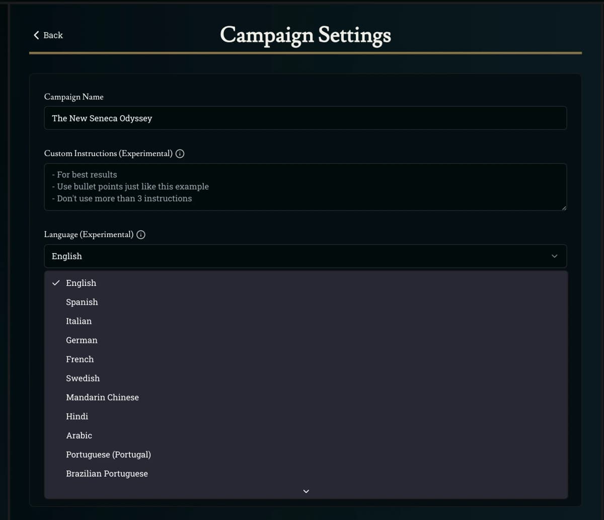 For those who don't know, you can update your language in Campaign Settings. Keep in mind this language support is only in Franz's responses for now, and is experimental. If you are using one of these languages, please let us know how it goes!