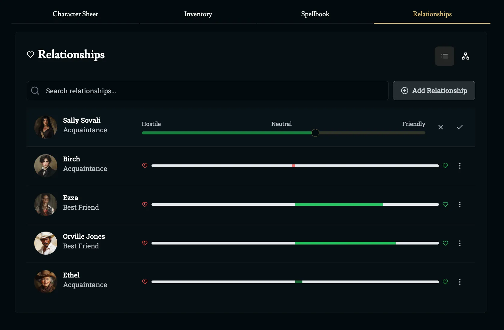 Relationships now show up as a separate tab in character sheets, and you can now edit them both in campaigns and when you’re building worlds.