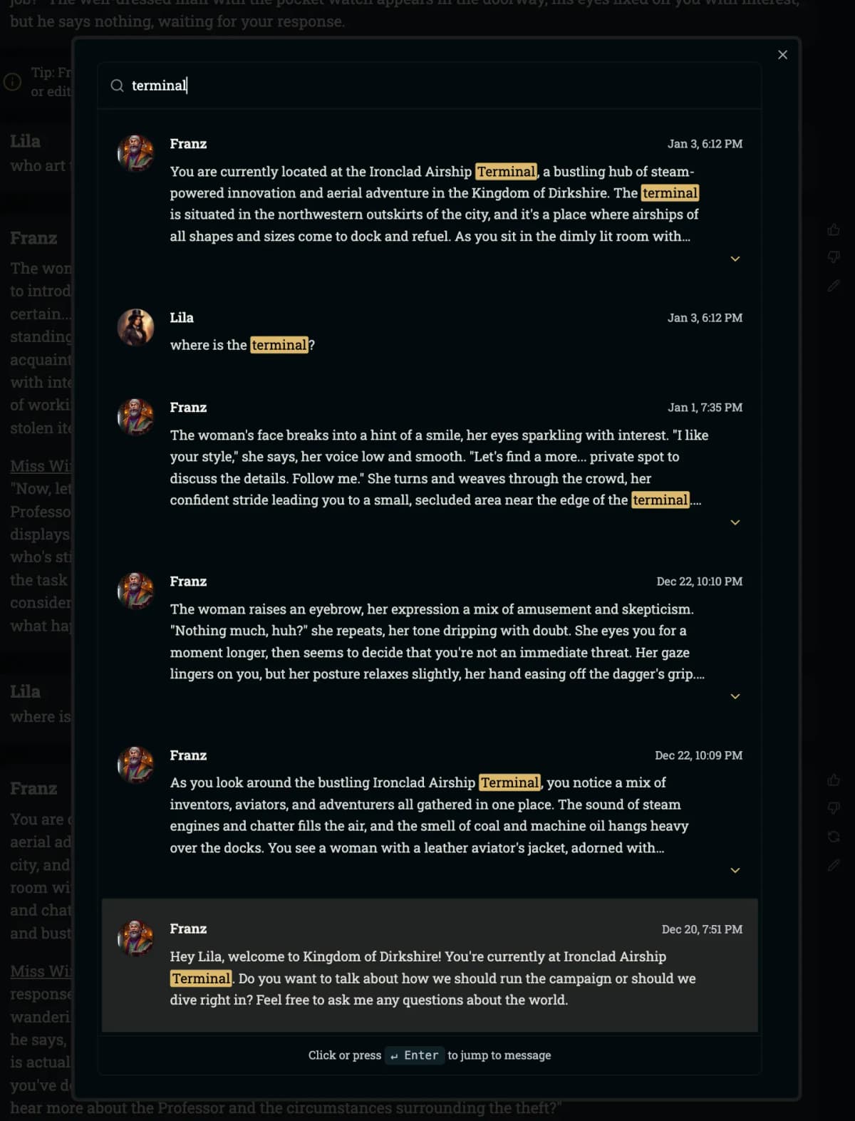 For long campaigns it’s been really hard to scroll to previous messages and impossible to search through your campaign history. Well not anymore! Scrolling up to old messages in your campaigns is now a lot smoother, and you can also now search for messages in your campaign.