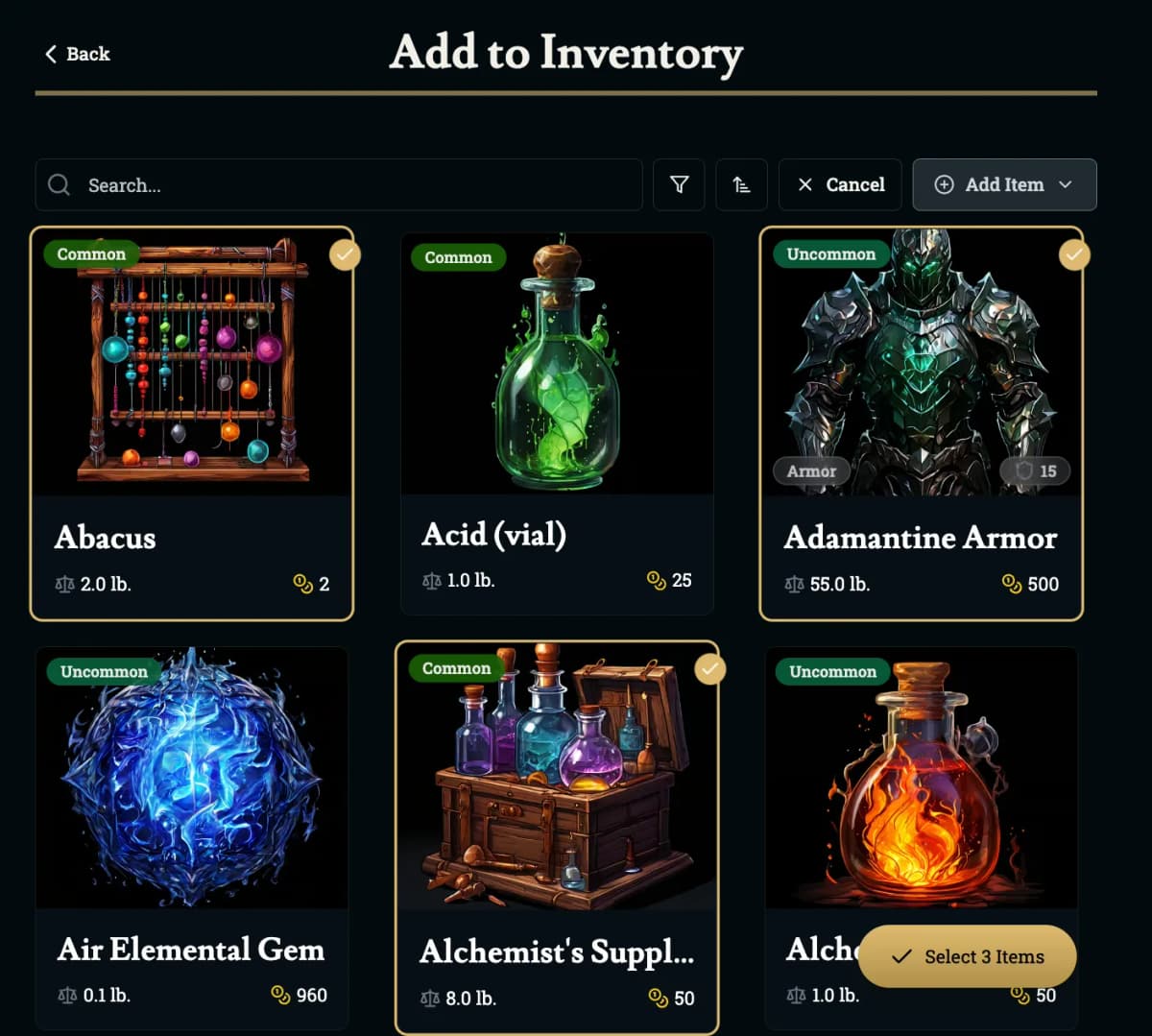 You can now select and add multiple items to your characters inventory and from the workshop to your world at one time. Doing this for other entities such as characters, classes, spells, etc. is coming soon along with other data syncing features.