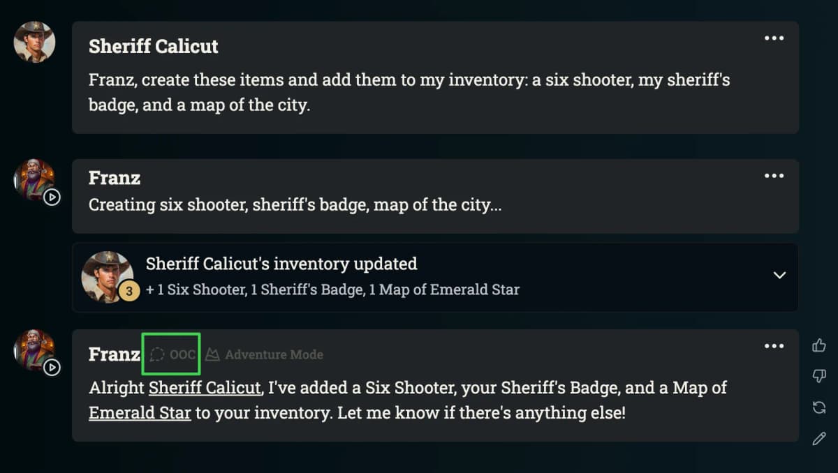Previously if you told Franz to “update X” or “Add Y to my inventory”, he may or may not do it. Now, we’ve created a special OOC mode where he is much more likely to complete your requests accurately.