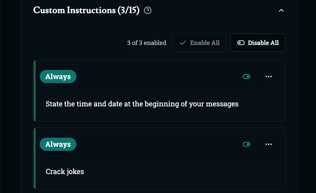 We know that some of you want to get the most out of custom instructions and cram as many in as possible, but this may actually lead to a worse experience. Let’s say you are DMing a campaign in person and have 5 focused notes in front of you. Now let’s say you have 500 notes. In which situation do you think you’ll do better? You should definitely use custom instructions to get Franz to do what you want to do, but try to keep them clean and focused. If it would be confusing for you as a human to follow the instructions, it might be confusing for Franz too!