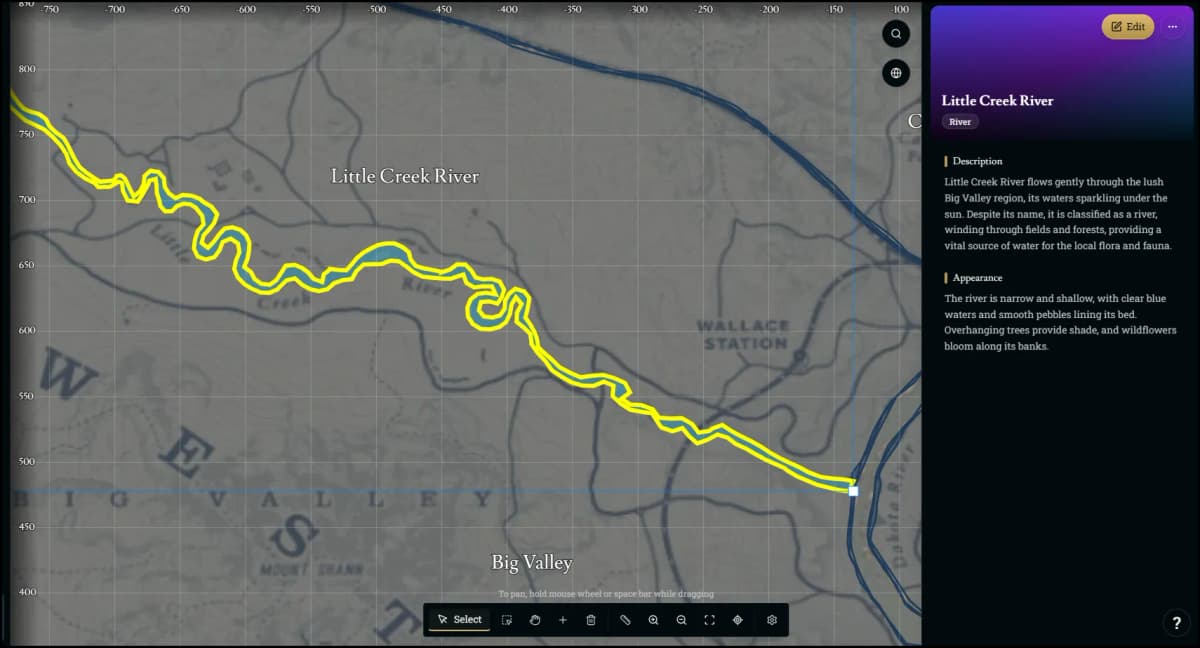 To select a character that is at a POI, select the POI and then select the character from the sidebar, or search the character in the sidebar and then select them. When a character is selected, they will pop out of the POI cluster and be available to move anywhere.
