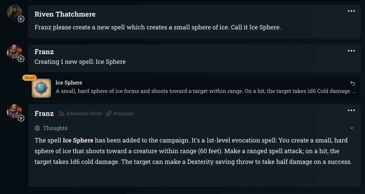 In OOC mode, Franz can now create simple races, classes, factions, and spells.