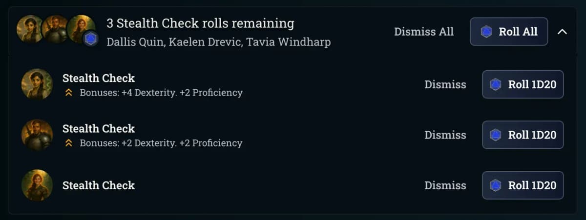 We know this has been a problem for a while, but we have finally gotten around to improving group rolls. When Franz requests rolls from you and other characters in your party, you can now click “Roll All” or handle individual rolls for NPCs. Franz will continue once all rolls are pressed or dismissed.