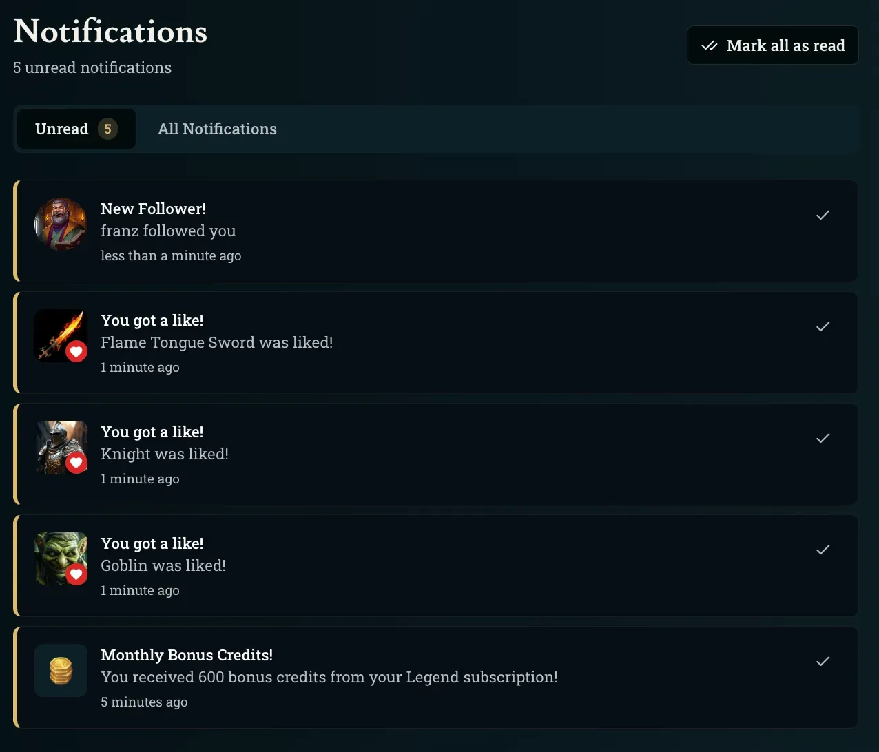 In app notifications are now also viewable. For now this supports notifying you when your content was liked, when you got new followers, or when you received credits. We’ll be adding more notification types and controls in the future.