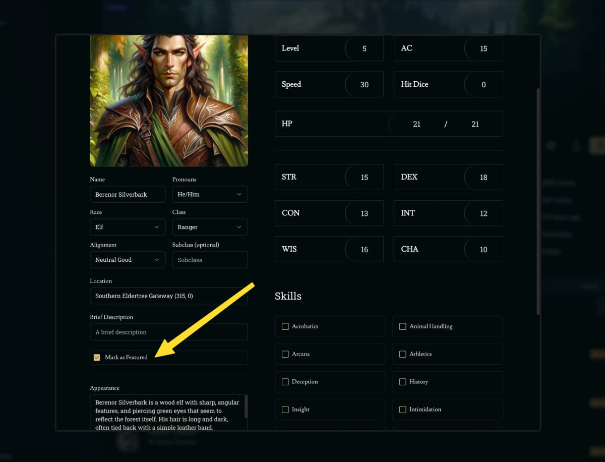 As a world builder, can differentiate to your players which characters are meant to be player characters. To do this, you can mark a character as featured when editing a character.