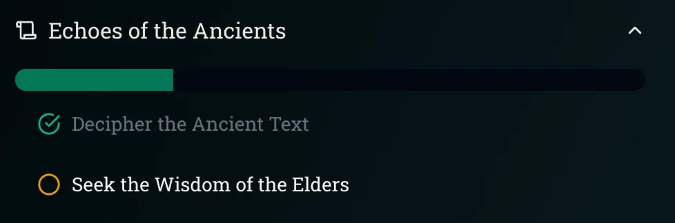 Hidden Objectives: In the Quests panel, you'll only be able to see your current objective. The remaining items will be hidden until you reach that step.
