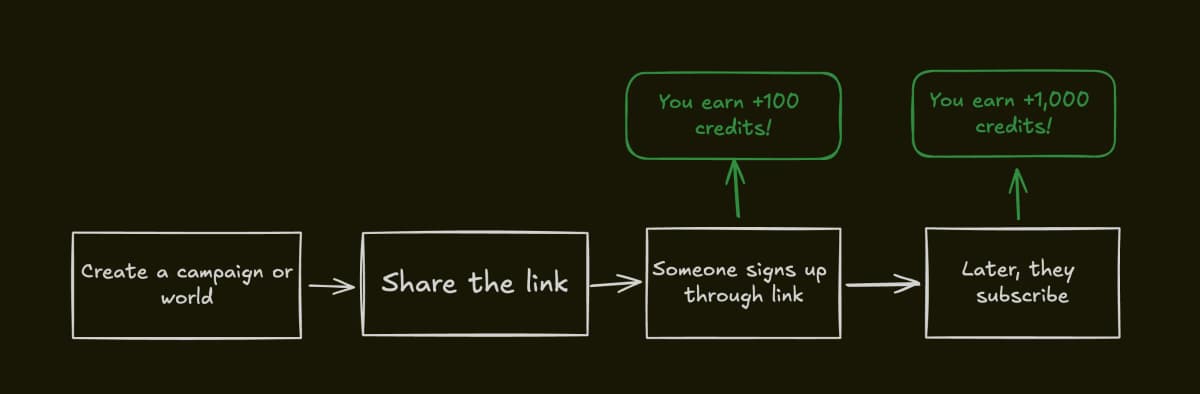 You’ll now be able to earn credits when people sign up after seeing a world you shared or being invited to your campaign. You’ll get even more credits if they end up subscribing!